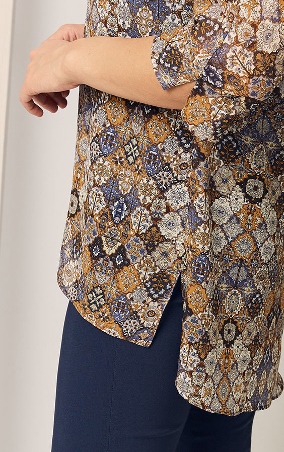 Tunika Cerano to niebanalne połączenie barw i wzorów.Kolory w stylistyce boho. Ta luźna tunika będzie się doskonale nosiła. Zapewni Ci komfort, wygodę i dobre samopoczucie. Okrągły dekolt ozdobiony srebrną lamówką. Rękaw ma modną długość ¾. Jej tył jest dłuższy, a po bokach umieściliśmy stylowe wycięcia. Kolorystyka to połączenie niebieskiego, musztardowego i drobnych elementów w innych barwach