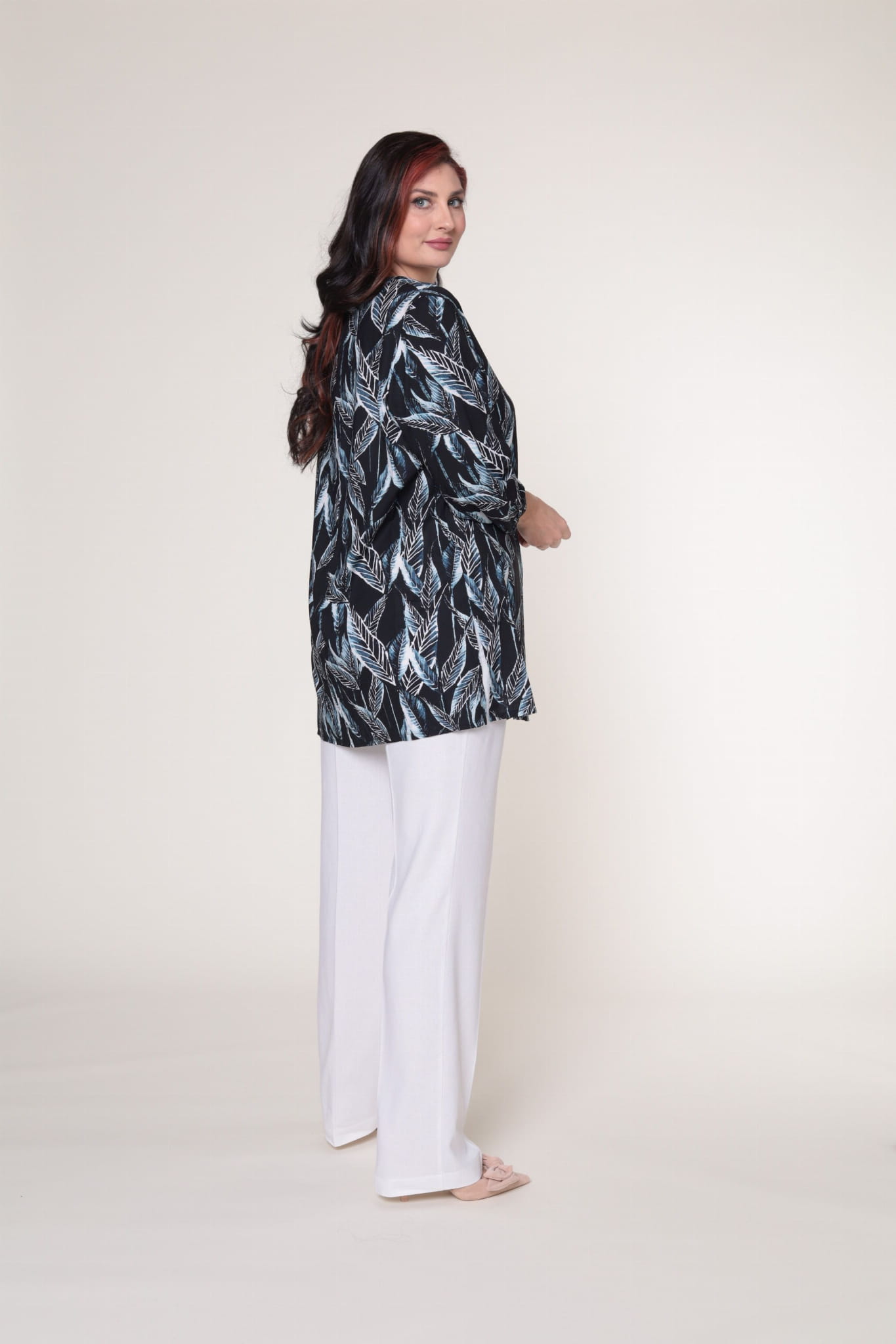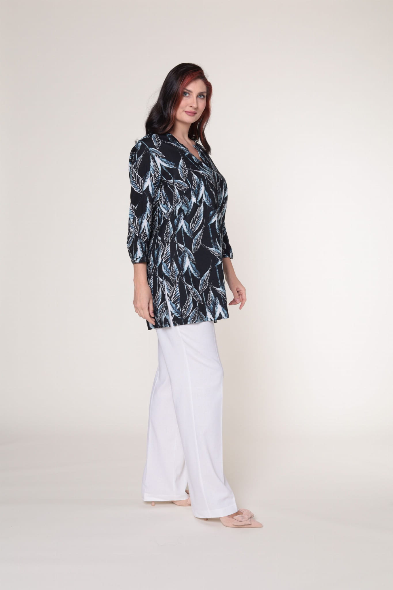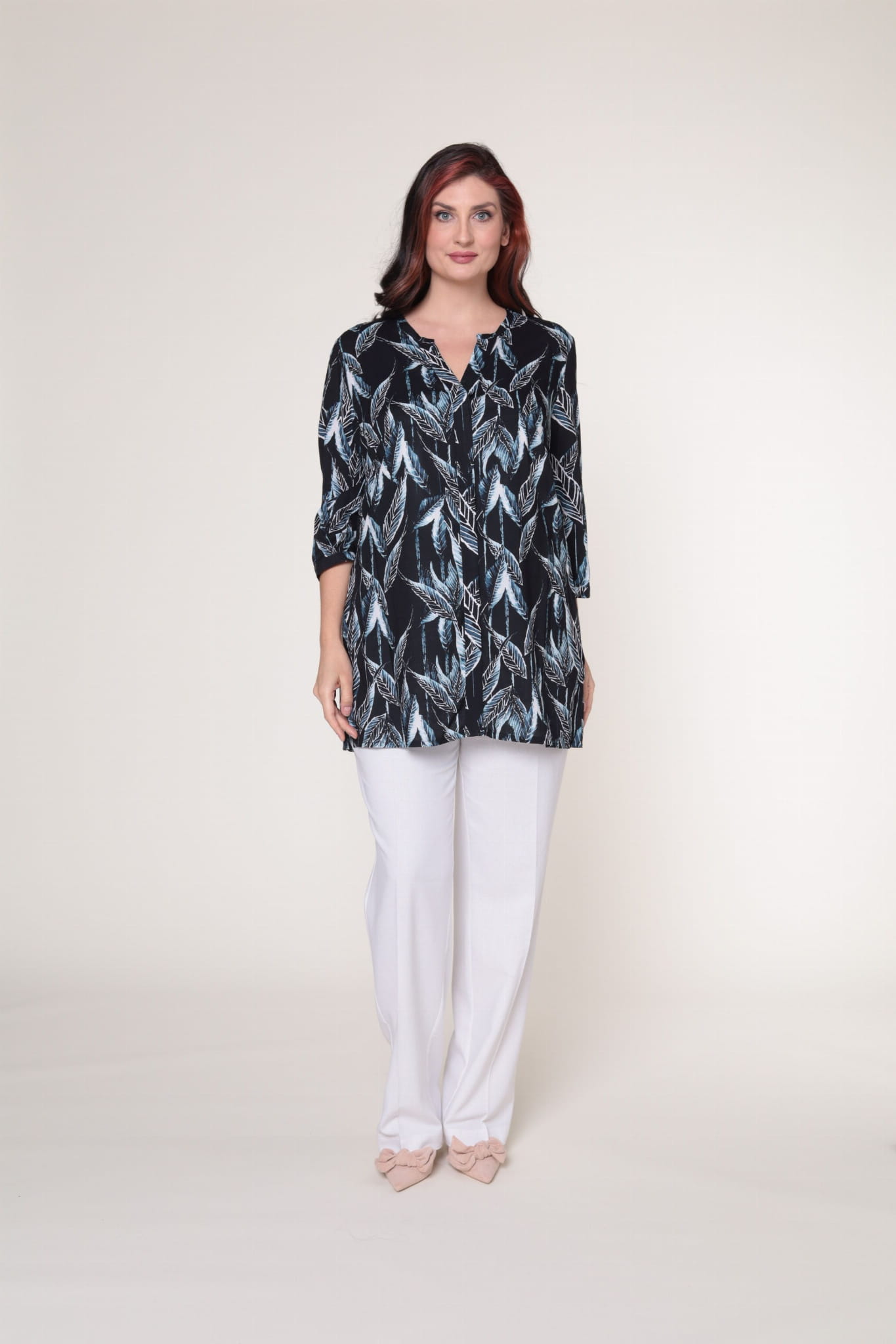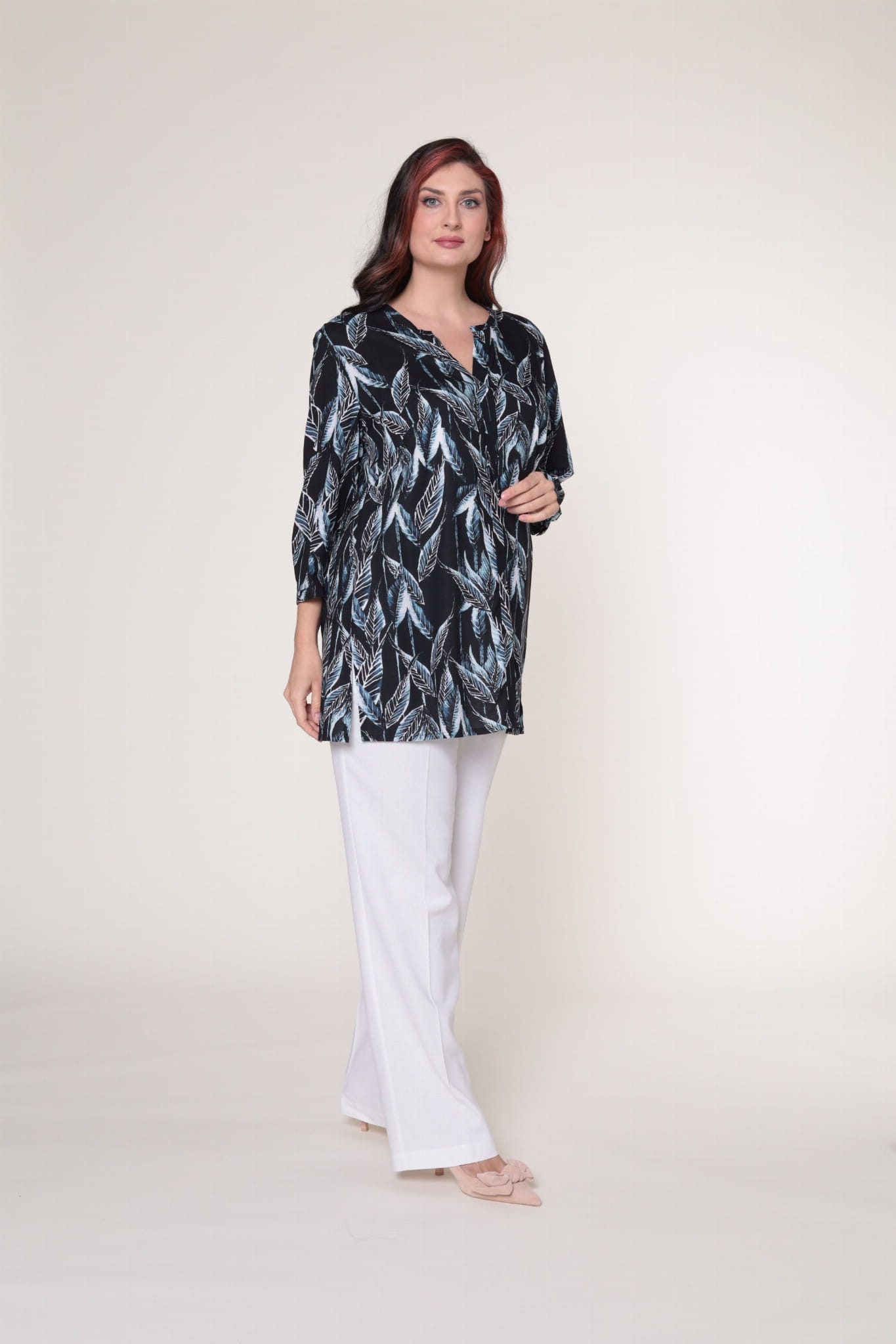 - wzorzysta tunika w kolorze granatowym z motywem roślinnym