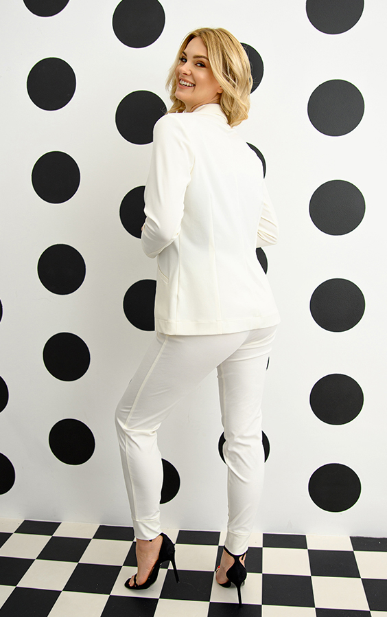 Żakiet to klasyka, która od lat nie wychodzi z mody. Na pewno każda z Was ma przynajmniej jeden żakiet w swojej szafie. Najbardziej elegancki, klasyczny i uniwersalny jest czarny, dlatego od takiego koloru warto zacząć kompletowanie garderoby. Kremowy żakiet Augusto to świetny wybór na cieplejsze dni. Przepięknie rozjaśni wszystkie Twoje wiosenno-letnie stylizacje. Żakiet Augusto, krój z delikatnymi pionowymi przeszyciami, które optycznie wysmuklają sylwetkę, niezapinany. Po bokach znajdują się dwie patki imitujące kieszenie. Jeżeli chcesz stworzyć jednokolorowy komplet, zestaw go z naszymi kremowymi spodniami Toba.  Jasny żakiet Augusto uszyty jest z miękkiej dzianiny, która dzięki swojej elastyczności pięknie układa się na sylwetce i zapewnia maksimum wygody, nie krępuje ruchów i jest bardzo przyjemna w dotyku. Świetnie pasuje do casualowych i sportowych stylizacji.