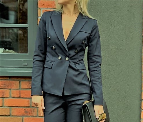 Marynarka dwurzędowa, zapinana w talii na dwa guziki, taliowana, pięknie dopasowana, świetnie modeluje sylwetkę, bardzo elegancki i wygodny w noszeniu.