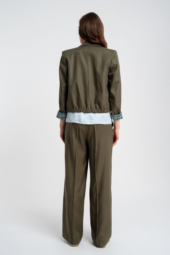 Model zapinany jest na 2 guziki, a prosta linia marynarki została dodatkowo przełamana ciekawym detalem – kontrastową podszewką przy mankietach, która po podwinięciu rękawów odsłania dekoracyjny wzór.