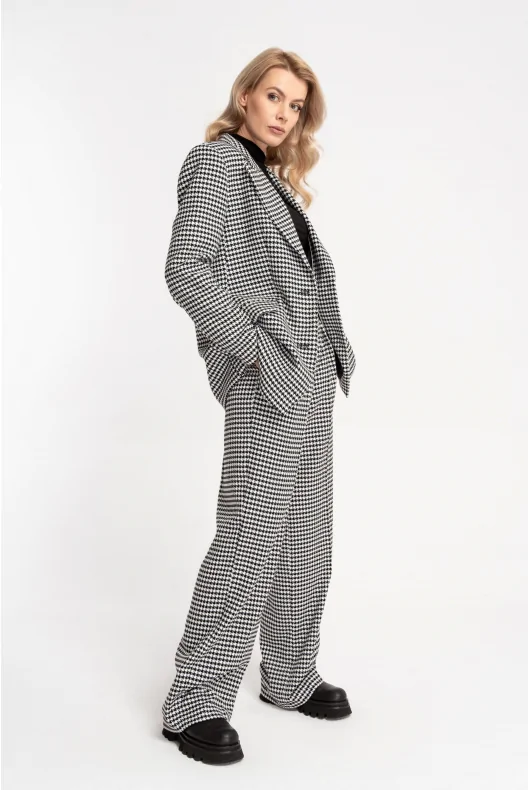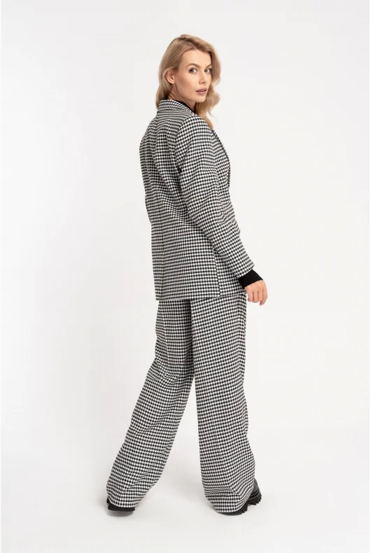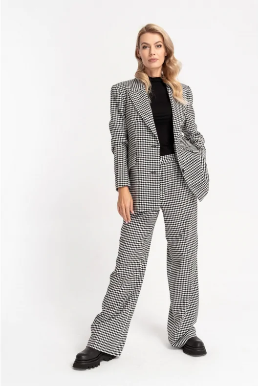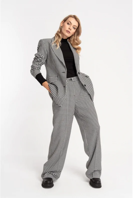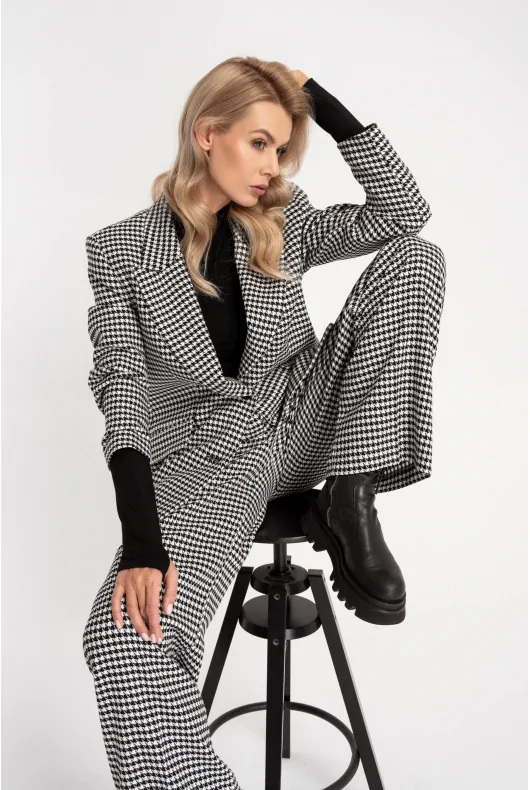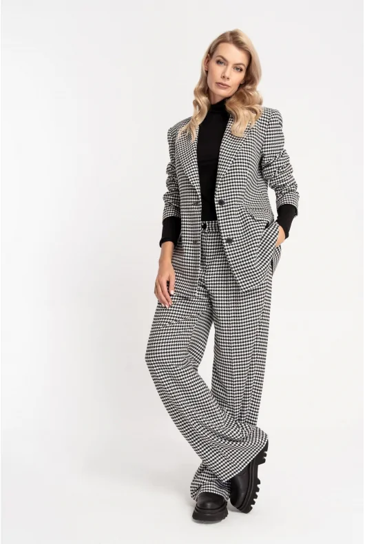 Prosta marynarka o przedłużonym fasonie. Na przodzie dwie wpuszczone kieszenie z listwami i patkami. Duży kołnierz z ostro zakończonymi klapami. Zapinana na dwa guziki, ułożone w jednym rzędzie. Z tyłu rozcięcie. Ramiona lekko usztywnione poduszkami. Czarna, satynowa podszewka, zapewni eleganckie wykończenie. W zależności od wyboru dodatków sprawdzi się zarówno do biura jak i w casualowych stylizacjach. Możliwe zestawienie ze spodniami DARIO lub TILDA