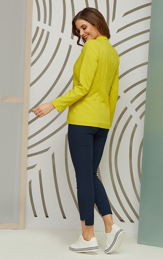 Żakiet w modnym limonkowym kolorze, zapinany na dwa srebrne guziki. Z przodu dwie patki imitujące kieszenie, na ramionach wszyte poduszki. Pionowe przeszycia optycznie wysmuklają sylwetkę, z podszewką. Idealny do codziennych, casualowych stylizacji.