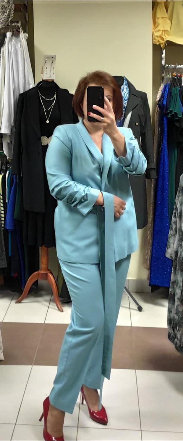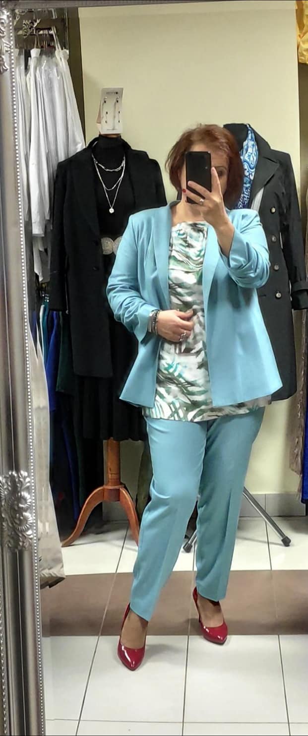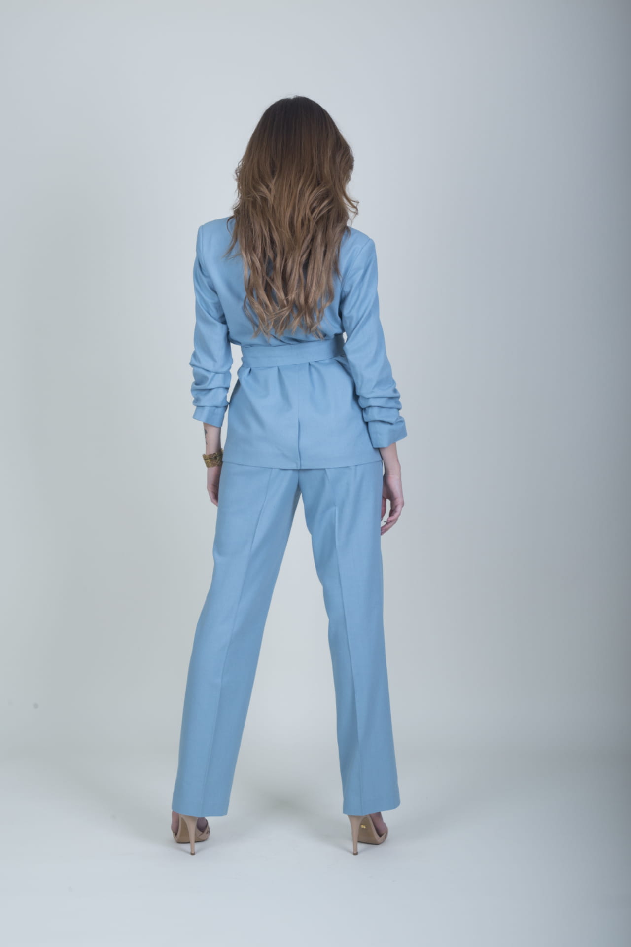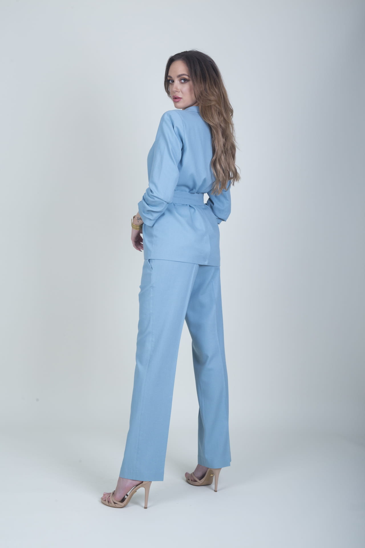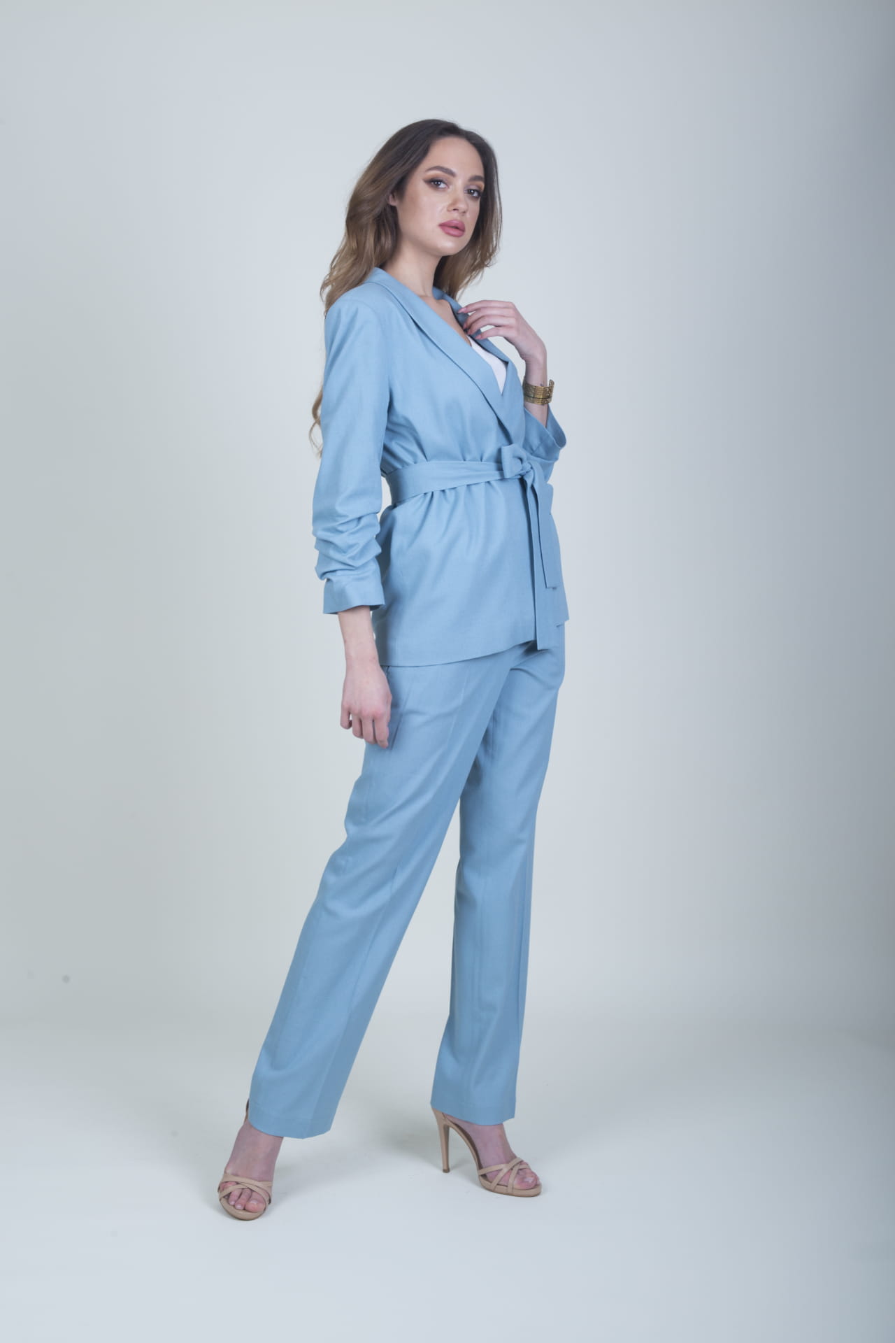 Marynarka damska z lnu i wiskozy w kolorze morskim, o luźnym kroju, bez zapięcia. Kołnierz szalowy. Niewątpliwą ozdobą jest ciekawe wykończenie rękawa, jest on marszczony o długości 3/4. W ramionach wszyte poduszki. Do marynarki dołączony jest tekstylny pasek, do ewentualnego przewiązania w talii.